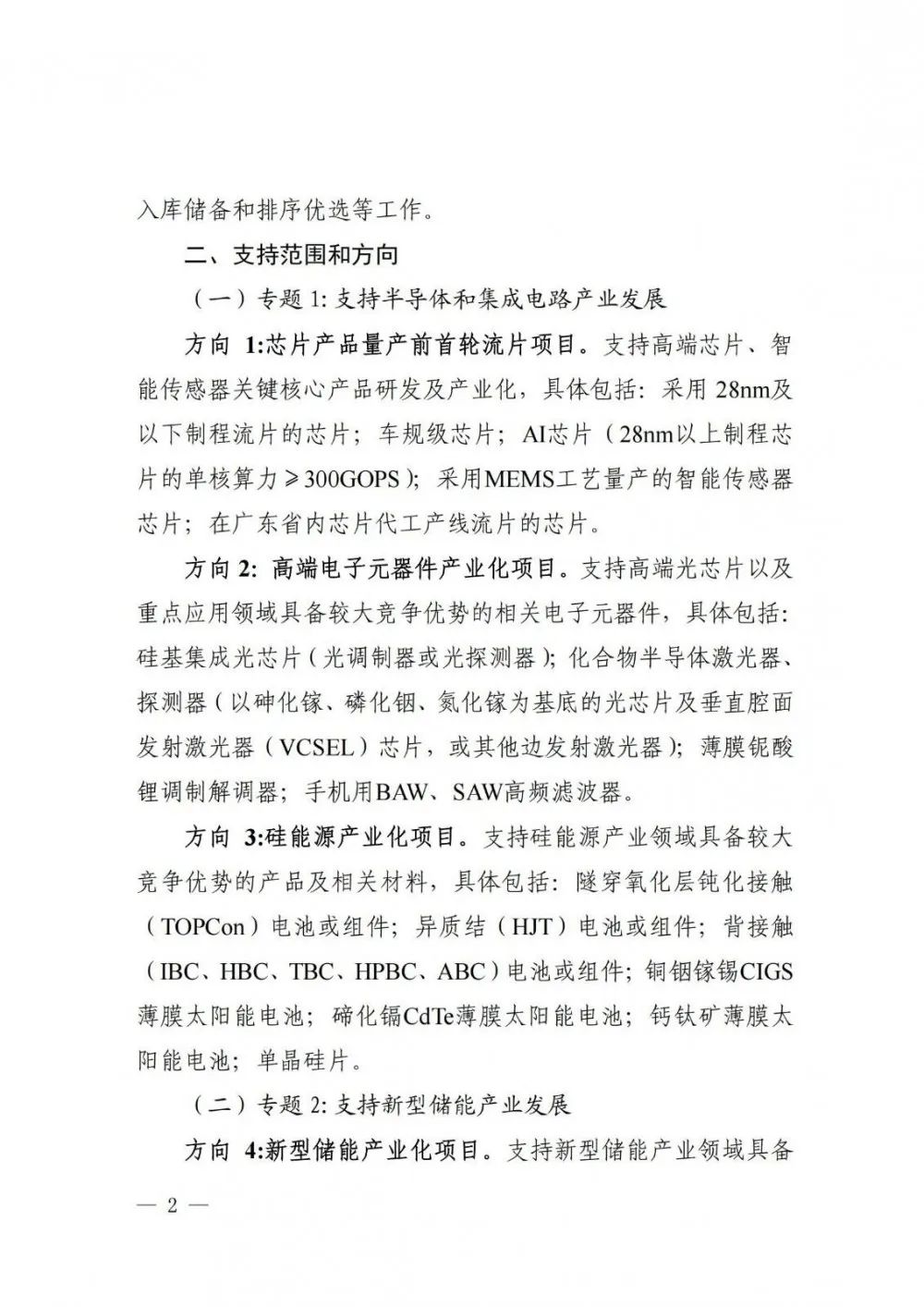 方向1:芯片產(chǎn)品量產(chǎn)前首輪流片項(xiàng)目。支持高端芯片、智能傳感器關(guān)鍵核心產(chǎn)品研發(fā)及產(chǎn)業(yè)化,具體包括:采用 28nm及以下制程流片的芯片;車規(guī)級(jí)芯片;AI芯片(28nm以上制程芯片的單核算力≥300GOPS);采用MEMS工藝量產(chǎn)的智能傳感器芯片;在廣東省內(nèi)芯片代工產(chǎn)線流片的芯片。