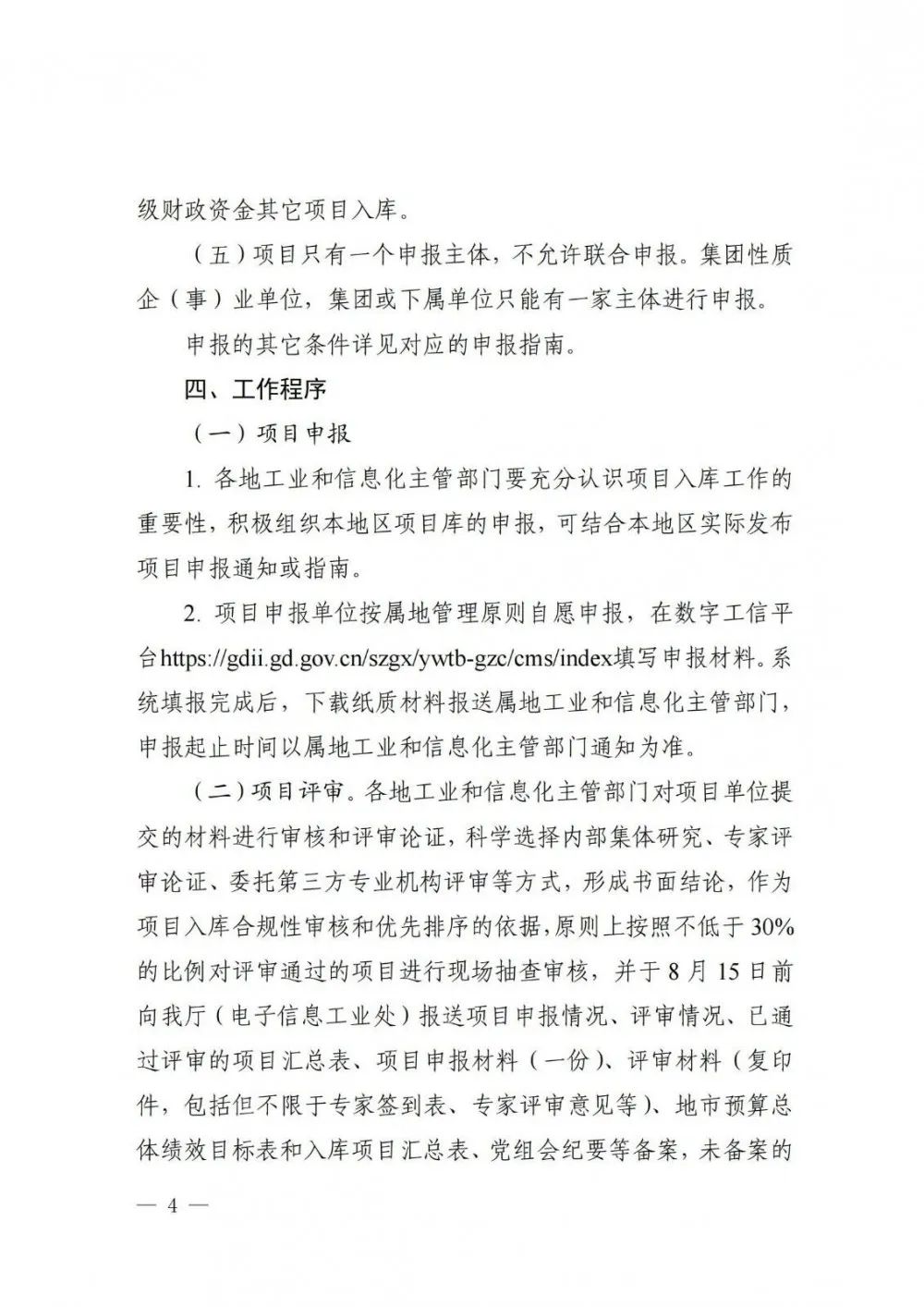 (一)項(xiàng)目申報(bào)。項(xiàng)目申報(bào)單位按屬地管理原則自愿申報(bào),在數(shù)字工信平臺(tái)(https://gdii.gd.gov.cn/szgx/ywtb-gzc/cms/index)填寫申報(bào)材料。系統(tǒng)填報(bào)完成后,下載紙質(zhì)材料報(bào)送屬地區(qū)(縣)工業(yè)和信息化主管部門。