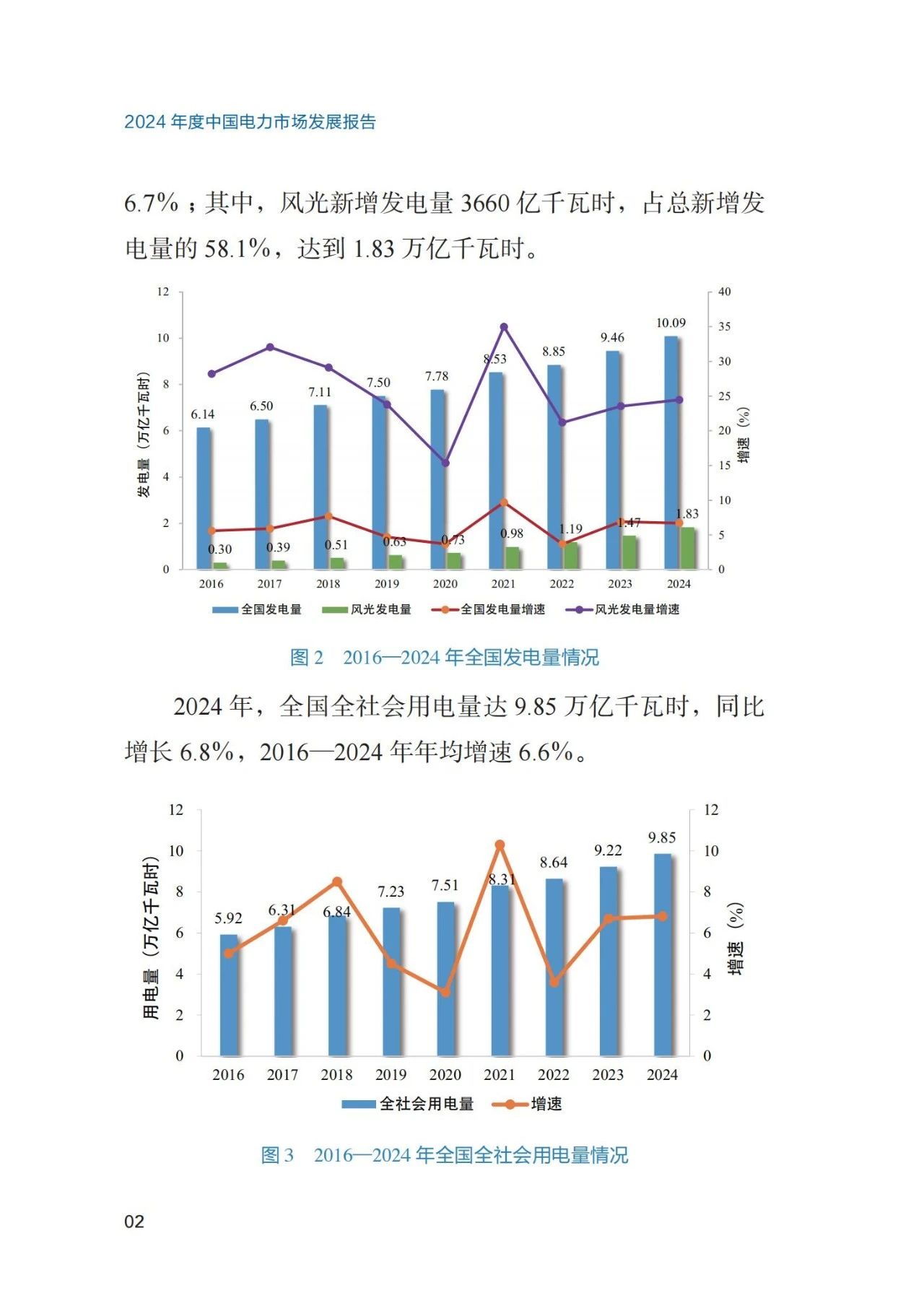 2024 年,全國(guó)發(fā)電量10.09萬(wàn)億千瓦時(shí),同比增長(zhǎng)6.7%;其中,風(fēng)光新增發(fā)電量3660億千瓦時(shí),占總新增發(fā)電量的58.1%,達(dá)到1.83萬(wàn)億千瓦時(shí)。2024年,全國(guó)全社會(huì)用電量達(dá)9.85萬(wàn)億千瓦時(shí),同比增長(zhǎng) 6.8%,2016—2024年年均增速 6.6%。
