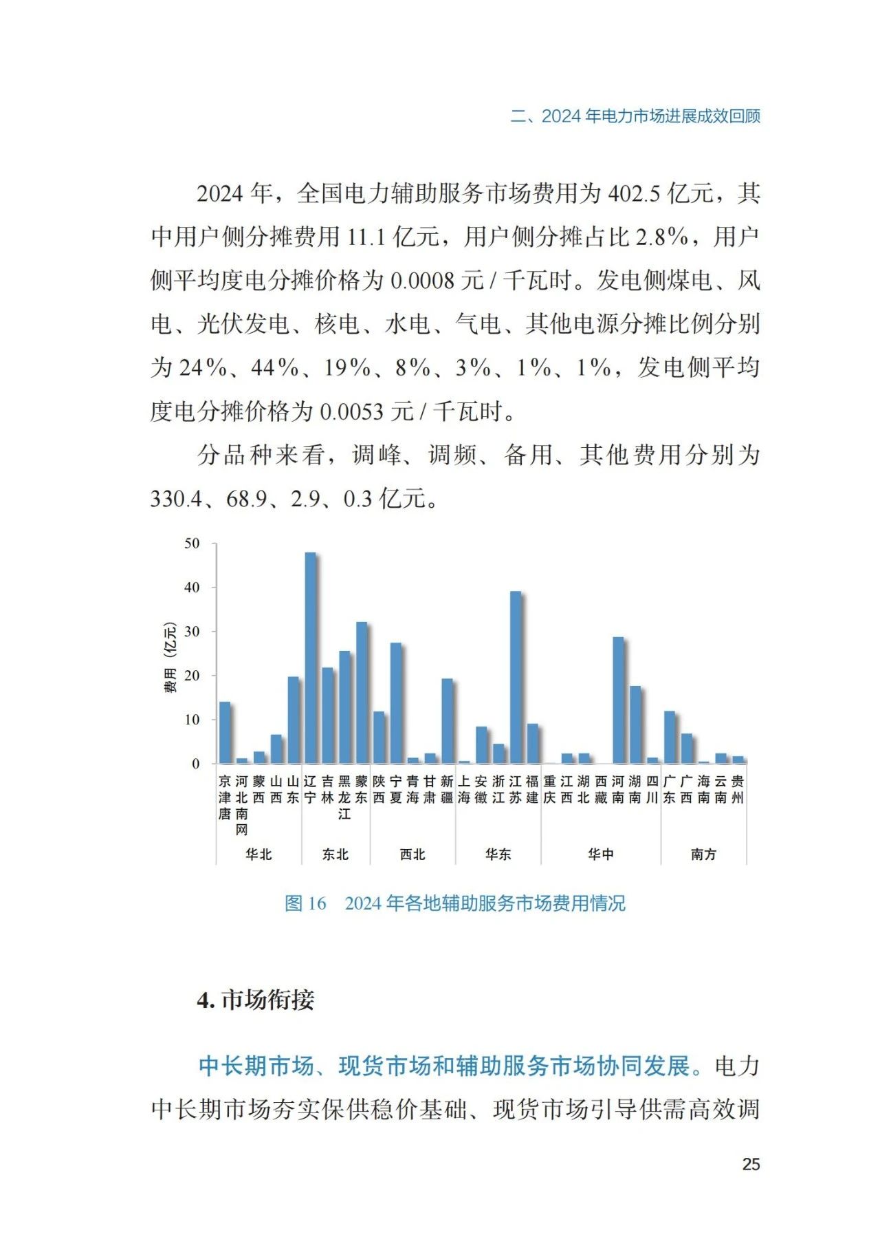 2024年,全國(guó)電力輔助服務(wù)市場(chǎng)費(fèi)用為402.5億元,其中用戶(hù)側(cè)分?jǐn)傎M(fèi)用11.1億元,用戶(hù)側(cè)分?jǐn)傉急?.8%,用戶(hù)側(cè)平均度電分?jǐn)們r(jià)格為0.0008元/千瓦時(shí)。發(fā)電側(cè)煤電、風(fēng)電、光伏發(fā)電、核電、水電、氣電、其他電源分?jǐn)偙壤謩e為 24%、44%、19%、8%、3%、1%、1%,發(fā)電側(cè)平均度電分?jǐn)們r(jià)格為0.0053元/千瓦時(shí)。