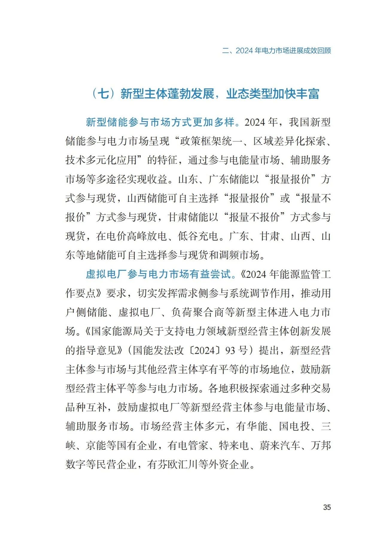 虛擬電廠參與電力市場(chǎng)有益嘗試。《2024年能源監(jiān)管工作要點(diǎn)》要求,切實(shí)發(fā)揮需求側(cè)參與系統(tǒng)調(diào)節(jié)作用,推動(dòng)用戶(hù)側(cè)儲(chǔ)能、虛擬電廠、負(fù)荷聚合商等新型主體進(jìn)入電力市場(chǎng)?!秶?guó)家能源局關(guān)于支持電力領(lǐng)域新型經(jīng)營(yíng)主體創(chuàng)新發(fā)展的指導(dǎo)意見(jiàn)》(國(guó)能發(fā)法改〔2024〕93號(hào))提出,新型經(jīng)營(yíng)主體參與市場(chǎng)與其他經(jīng)營(yíng)主體享有平等的市場(chǎng)地位,鼓勵(lì)新型經(jīng)營(yíng)主體平等參與電力市場(chǎng)。各地積極探索通過(guò)多種交易品種互補(bǔ),鼓勵(lì)虛擬電廠等新型經(jīng)營(yíng)主體參與電能量市場(chǎng),輔助服務(wù)市場(chǎng)。市場(chǎng)經(jīng)營(yíng)主體多元,有華能、國(guó)電投、三峽、京能等國(guó)有企業(yè),有電管家、特來(lái)電、蔚來(lái)汽車(chē)、萬(wàn)邦數(shù)字等民營(yíng)企業(yè),有芬歐匯川等外資企業(yè)。
