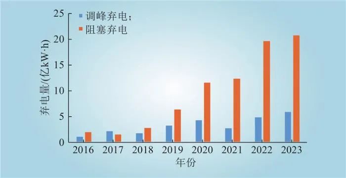 圖2 2016—2023年CAISO運營區(qū)域新能源調(diào)峰棄電和阻塞棄電分析