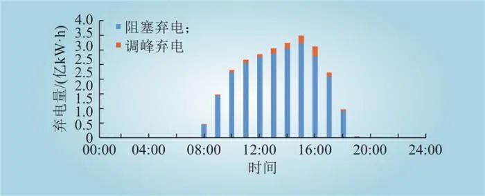 CAISO運營區(qū)域新能源棄電呈現(xiàn)“時段不均衡”特性,日內(nèi)棄電主要集中在09:00—18:00時段。CAISO運營區(qū)域日內(nèi)新能源棄電呈現(xiàn)“白天高、夜間低”的特征,白天光伏大發(fā)期間調(diào)峰棄電和阻塞棄電均大幅增加。今年以來,新能源日內(nèi)累計阻塞棄電量24.26億kW·h、占比94%,調(diào)峰棄電量1.66億kW·h、占比6%。今年以來CAISO運營區(qū)域新能源日內(nèi)累計調(diào)峰棄電和阻塞棄電分析如圖4所示。