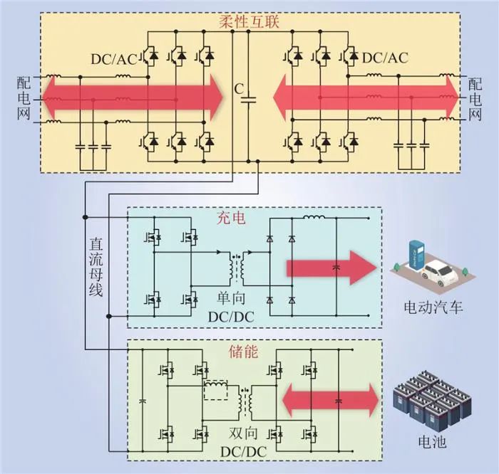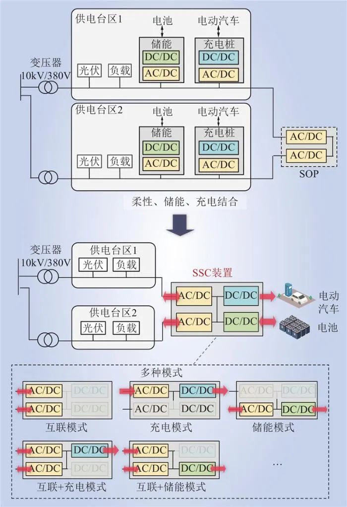SSC裝置由SOP、儲能、充電樁組合而成,如圖1所示。傳統(tǒng)思路多采用SOP、儲能、充電樁分離的思路,整體成本較高,且在實際運營中面臨設(shè)備利用率低的問題,導(dǎo)致資源浪費。