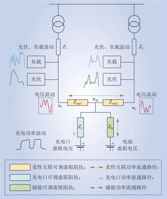 為此構(gòu)建如圖3所示虛擬阻抗網(wǎng)絡(luò),將SSC等效成包含2個柔性互聯(lián)阻抗(Zsop1、Zsop2)、一個電池阻抗ZB、一個充電阻抗ZC的阻抗網(wǎng)絡(luò),充電口和電池均等效成虛擬電壓。通過上述處理,便可在功率層面將包含DC/DC、DC/AC變換器的SSC等效成簡單的電路結(jié)構(gòu)。