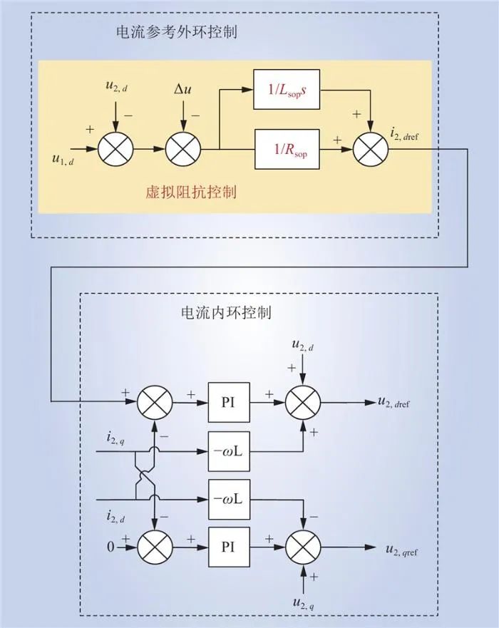 式中:i2,dref為功率控制側(cè)d軸電流信號參考值;Rsop為針對SOP設(shè)定的虛擬電阻值,該值越大,相同電壓差值下的i2,dref越小。