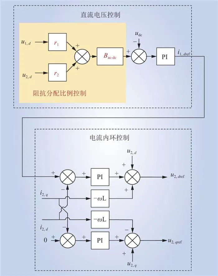 SOP輸出功率控制策略如圖4所示。通過PLL獲得SOP兩端交流電壓的d軸分量,分別表示為u1,d和u2,d,為了讓功率根據(jù)電壓高低自動流通,可通過式(1)獲得兩側(cè)SOP的電流參考值,即