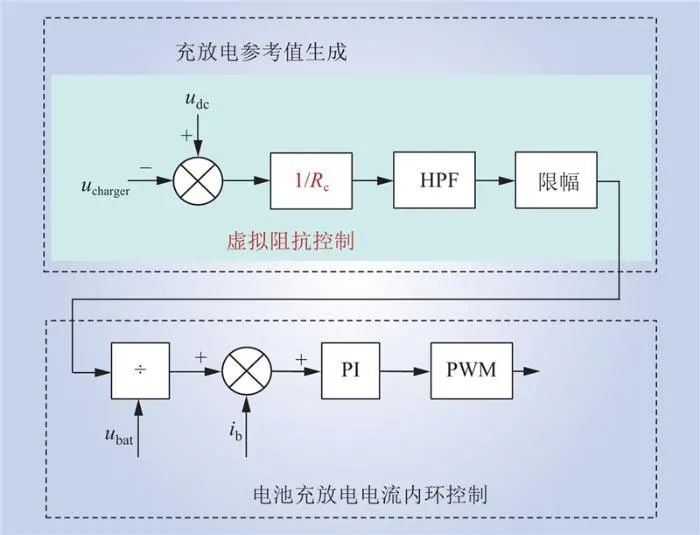 考慮到儲能系統(tǒng)通常需要控制電池端的功率,因此將直流側(cè)的電流參考值轉(zhuǎn)化成電池側(cè)的電流參考值,并基于該參考值控制電池的充放電。其中LPF的作用是濾除直流電壓中的高頻波動,因此,儲能系統(tǒng)只須承擔(dān)其中的低頻波動部分,降低了儲能系統(tǒng)的充放電功率,提升了儲能系統(tǒng)的運行壽命。