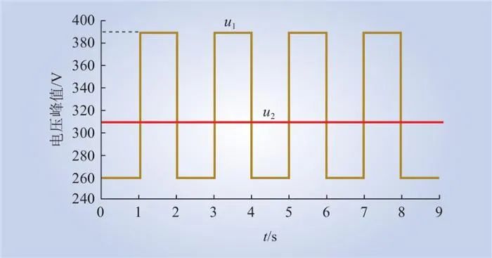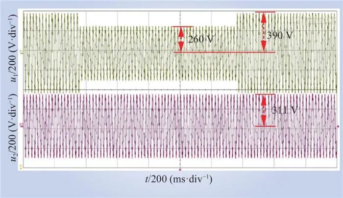首先,在不加入SSC裝置的情況下,測量兩端配電網(wǎng)的電壓波形,以反映配電網(wǎng)功率波動對配電網(wǎng)電壓的影響。圖11展示了配電網(wǎng)1中功率波動導(dǎo)致的電壓波動,其中配電網(wǎng)1中的電壓u1峰值為260~390 V,當(dāng)脈沖型功率源吸收功率時,線路壓降導(dǎo)致電壓較低,當(dāng)脈沖型功率源發(fā)出功率時,多余的功率向電網(wǎng)反向輸送導(dǎo)致電壓較高。配電網(wǎng)2作為配電網(wǎng)1的參考,其阻抗較低,因此電壓u2波動較小。進(jìn)一步,采集u1和u2的波形如圖12所示,由波形圖可知,u1的波動范圍較大,驗證了功率波動對配電網(wǎng)1電壓的影響較大。