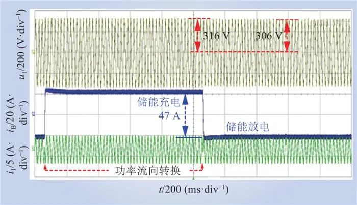 圖13展示了采用傳統(tǒng)方法時,配電網(wǎng)1電壓u1、儲能電流iB、SOP接入配電網(wǎng)1的電流i1的波形。當(dāng)配電網(wǎng)電壓較高時,配電網(wǎng)1能量富余,儲能開啟充電模式,充電電流iB為正,由i1的方向可知,此時功率從配電網(wǎng)1流向儲能,由于富余功率被儲能吸收,因此配電網(wǎng)1的電壓波動有所緩解,最大值從圖12中的390 V降低到圖13中的316 V,接近額定值311 V;反之,儲能開啟放電模式,功率從儲能流向配電網(wǎng),配電網(wǎng)1的電壓最小值從圖12的260 V提升到圖13中的306 V,接近額定值311 V。結(jié)果表明,采用傳統(tǒng)方法,通過調(diào)節(jié)儲能電池充放電,可以有效降低配電網(wǎng)的電壓波動。然而,由iB波形可知,此時儲能充放電電流差值高達(dá)47 A,導(dǎo)致儲能大功率充放電,嚴(yán)重影響儲能的壽命。
