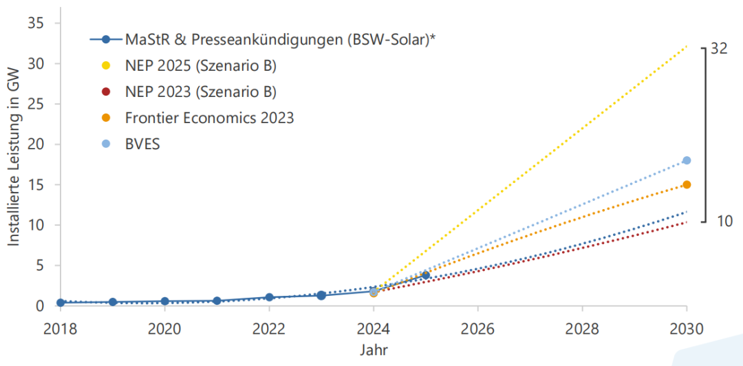 至2030年大型電池儲能系統(tǒng)的發(fā)展?;?[4], [5], [6], [7], [8] 的 FfE 分析。