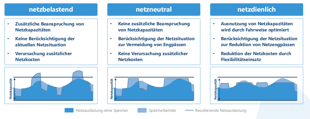 對于并網(wǎng)的、私人融資的儲能系統(tǒng),市場支持型和系統(tǒng)支持型的運(yùn)行模式——即長期和非常短期的供需時間平衡——目前構(gòu)成了其大部分收入來源。然而,這兩者都屬于“銅板層面”(auf der Kupferplatte)的應(yīng)用案例,因為無論是調(diào)頻服務(wù)還是電力交易所交易都不具有區(qū)域性成分,無法考慮電網(wǎng)的當(dāng)?shù)貭顩r。然而,根據(jù)當(dāng)前的電網(wǎng)狀況和位置,這些運(yùn)行模式可能對電網(wǎng)產(chǎn)生不同的影響。與此相對,存在一些明確基于當(dāng)前電網(wǎng)狀況的運(yùn)行模式。為區(qū)分對電網(wǎng)的影響,下文將界定“電網(wǎng)負(fù)荷型”(netzbelastend)、“電網(wǎng)中性型”(netzneutral)和“電網(wǎng)支持型”(netzdienlich)等概念(見圖3)[16]。