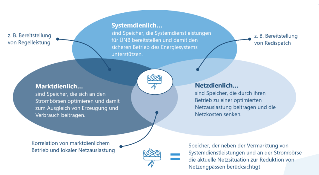 重要的是,這些定義并不與電網(wǎng)運(yùn)營商的具體工具綁定,而是可以通過不同的方法實現(xiàn)電網(wǎng)中性和電網(wǎng)支持型。這些定義本身并非對儲能系統(tǒng)的普遍要求。因此,工具的設(shè)計或使用也不應(yīng)一概而論,而應(yīng)始終以當(dāng)?shù)仉娋W(wǎng)狀況(即局部和臨時的網(wǎng)絡(luò)限制)為導(dǎo)向。