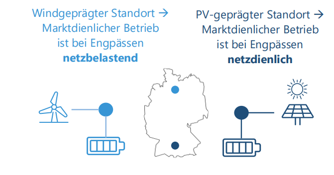 如果儲能系統(tǒng)的運(yùn)行模式不基于實際的電網(wǎng)負(fù)載情況,則必須假設(shè)該儲能系統(tǒng)在某些情況下會占用額外的電網(wǎng)容量。因此,連接此類儲能系統(tǒng)通常會導(dǎo)致公共電網(wǎng)擴(kuò)建的成本(投資性標(biāo)準(zhǔn)),為此需支付建設(shè)成本分?jǐn)傎M(fèi)(BKZ)。同樣,電網(wǎng)負(fù)荷型儲能系統(tǒng)的運(yùn)行方式可能導(dǎo)致(額外的)電網(wǎng)運(yùn)營商干預(yù),例如依據(jù)再調(diào)度(Redispatch)或《能源經(jīng)濟(jì)法》(EnWG)第14a條(操作性標(biāo)準(zhǔn))。一個例子就是在周邊可再生能源(EE)發(fā)電設(shè)施被限電的同時,從儲能系統(tǒng)向電網(wǎng)注入電力。