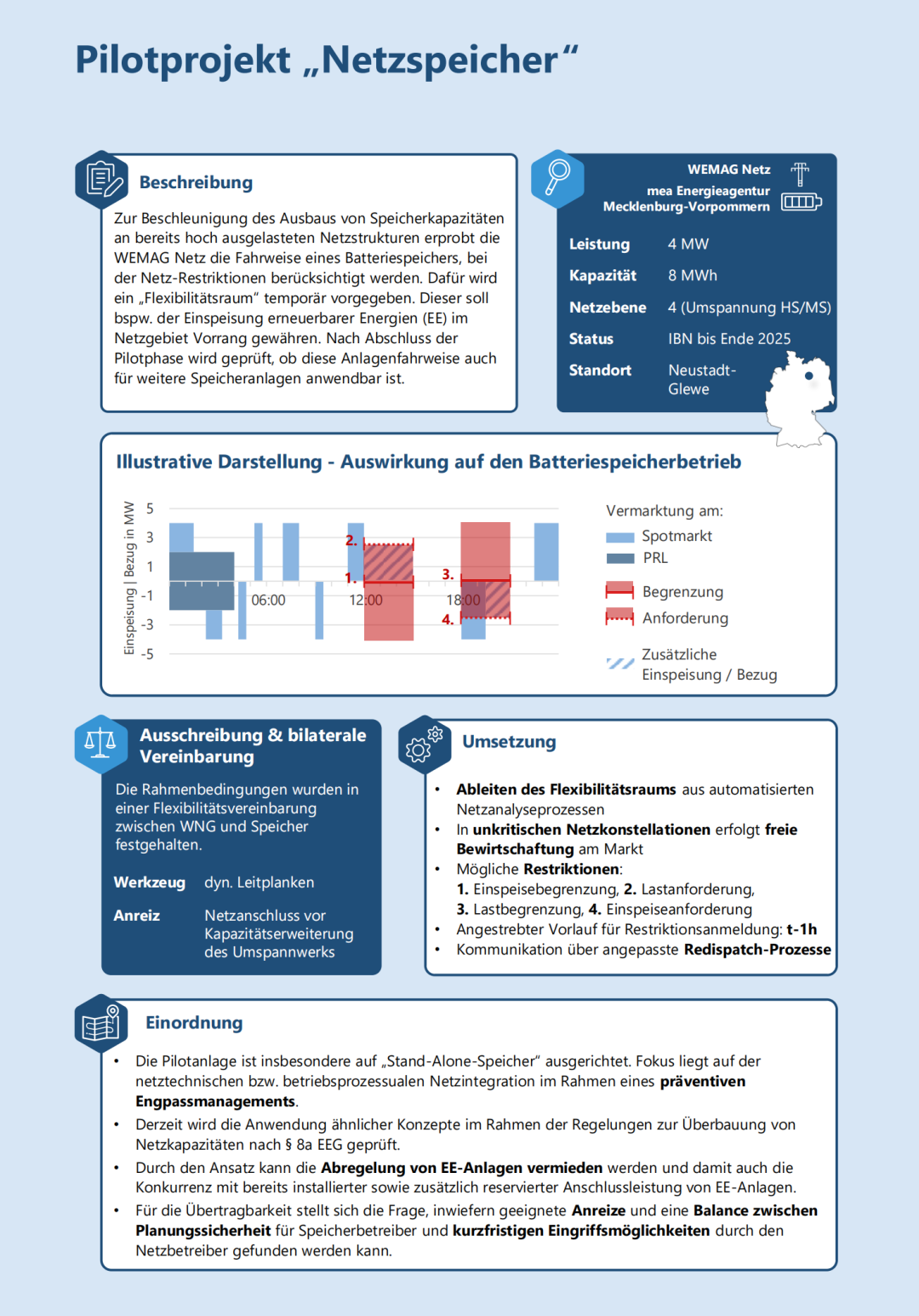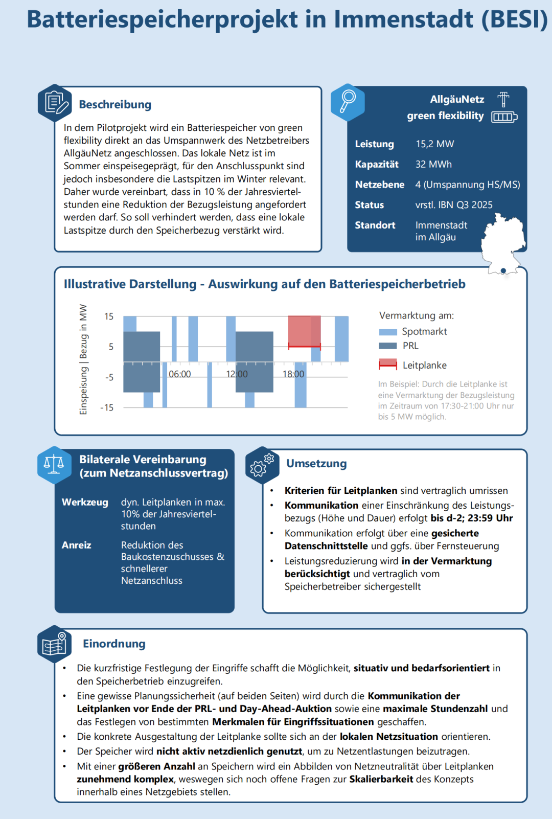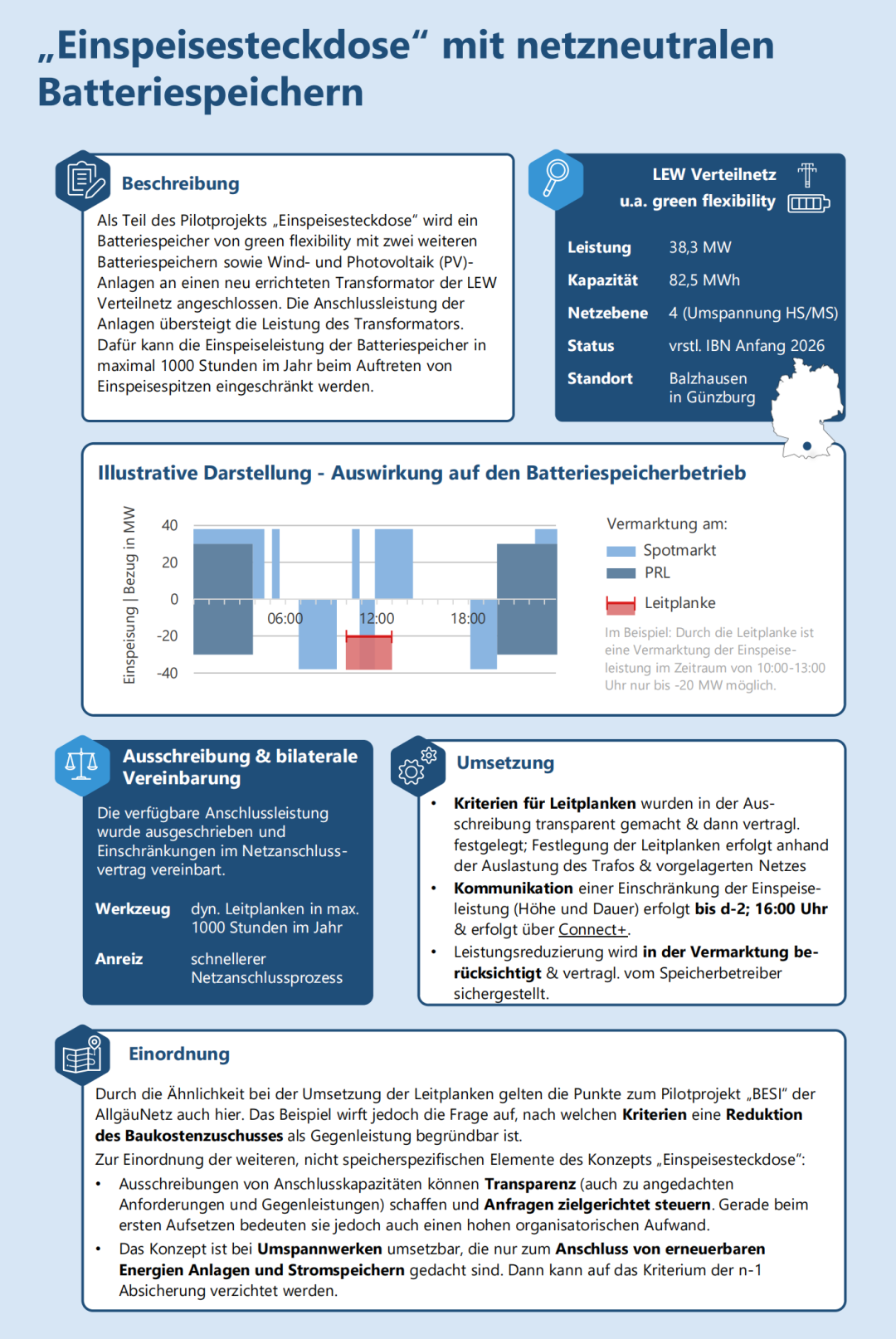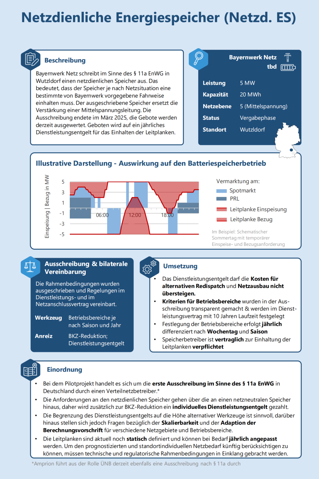 Bayernwerk Netz 依據(jù)《能源經(jīng)濟(jì)法》(EnWG)第11a條在武茨爾多夫(Wutzldorf)招標(biāo)一個電網(wǎng)支持型儲能系統(tǒng)。這意味著儲能系統(tǒng)必須根據(jù)電網(wǎng)狀況遵守Bayernwerk規(guī)定的特定運(yùn)行方式。招標(biāo)的儲能系統(tǒng)替代了一條中壓線路的升級。招標(biāo)于2025年3月結(jié)束,目前正在評估投標(biāo)。投標(biāo)針對的是遵守運(yùn)行邊界的年度服務(wù)費(fèi)。