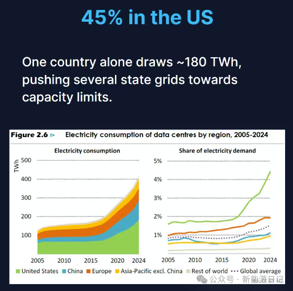 圖丨數(shù)據(jù)中心按地區(qū)劃分的電力消耗,美國的電力消耗占全球的45%。