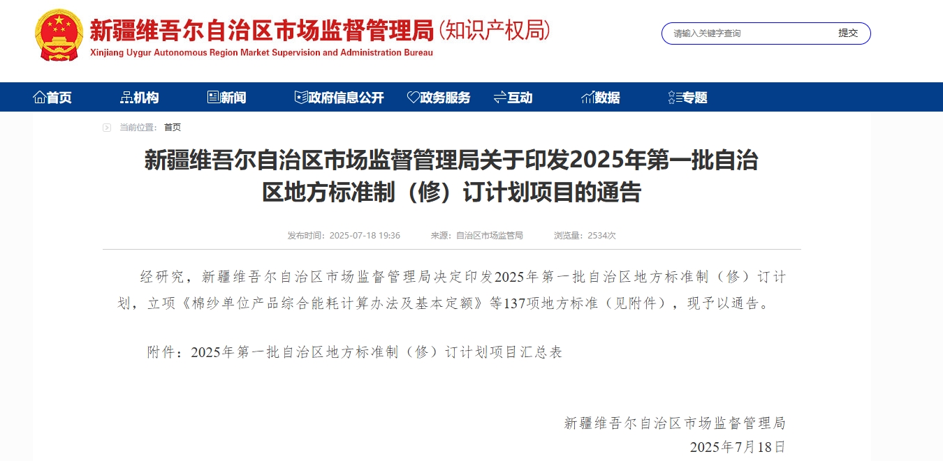 經(jīng)研究,新疆維吾爾自治區(qū)市場(chǎng)監(jiān)督管理局決定印發(fā)2025年第一批自治區(qū)地方標(biāo)準(zhǔn)制(修)訂計(jì)劃,立項(xiàng)《棉紗單位產(chǎn)品綜合能耗計(jì)算辦法及基本定額》等137項(xiàng)地方標(biāo)準(zhǔn)(見(jiàn)附件),現(xiàn)予以通告。