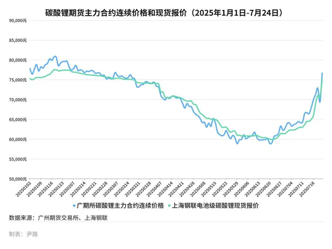 7月14日,廣州期貨交易所碳酸鋰期貨主力合約連續(xù)價格收盤價突破6.5萬元,7月21日突破7萬元,7月24日,收盤價76680元,突破7.5萬元。