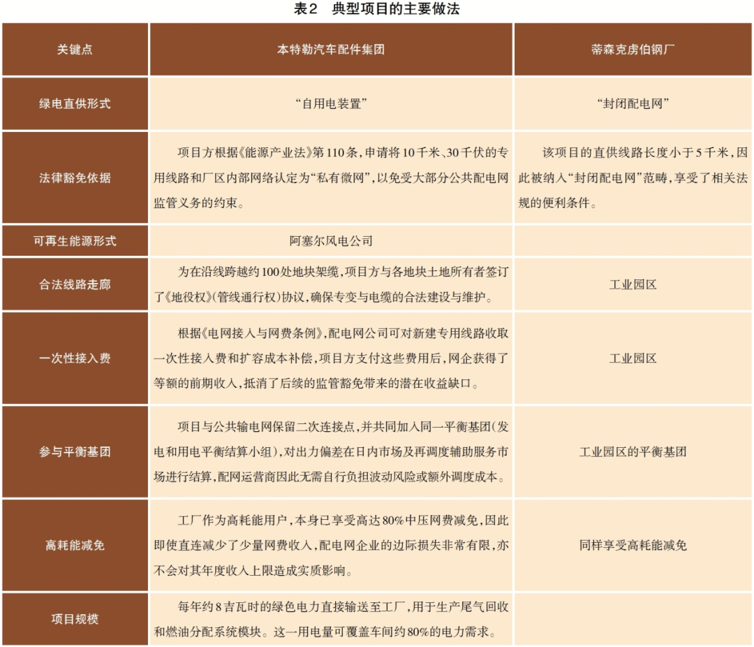2019年,在歐盟有關(guān)綠電直供的法令頒布后,德國開始推廣綠電直供。如典型案例本特勒和蒂森克虜伯風(fēng)電直供分別是“封閉配電網(wǎng)”和“自用電裝置”的兩個典型案例(見表2)。