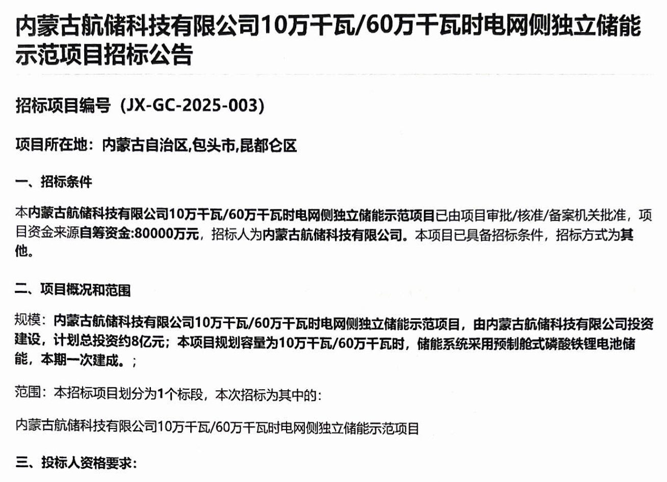 中國儲能網(wǎng)訊:7月25日,內蒙古航儲科技發(fā)布100MW/600MWh電網(wǎng)側獨立儲能示范項目EPC招標,文件顯示,該項目總投資8億元、為自籌資金,相當于單位造價1.33元/Wh。