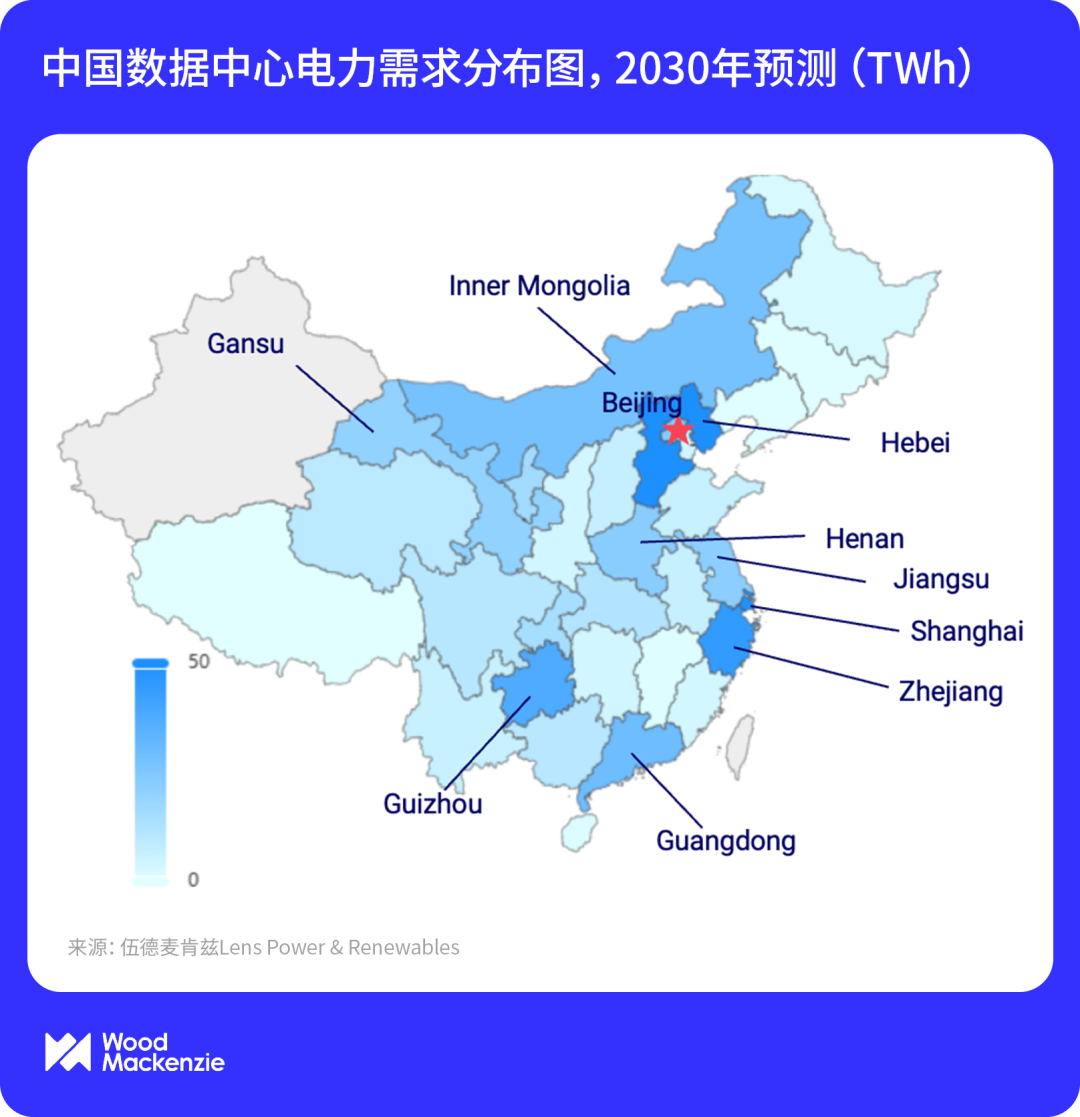 與美國(guó)情況類似,中國(guó)的數(shù)據(jù)中心同樣集中在特定區(qū)域。項(xiàng)目開發(fā)和電力需求主要集中在沿海城市,但隨著對(duì)低成本綠色能源的需求上升,建設(shè)正逐步向北部和中部地區(qū)擴(kuò)展。預(yù)計(jì)到2030年,中國(guó)將有20個(gè)省份的數(shù)據(jù)中心電力需求將超過(guò)20TWh,其中僅河北、上海和浙江地區(qū)的需求總和就將達(dá)到1,48TWh,這實(shí)際上相當(dāng)于中國(guó)版的PJM市場(chǎng)——即美國(guó)以賓夕法尼亞州為中心的電力市場(chǎng)。