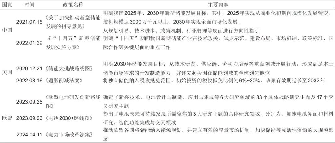 表1 中國、美國、歐盟三大主要經(jīng)濟(jì)體的儲能相關(guān)政策