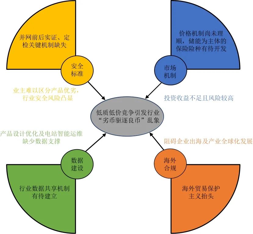 當(dāng)前,我國新型儲能已從研發(fā)示范階段轉(zhuǎn)向快速商業(yè)化推廣,低質(zhì)低價(jià)內(nèi)卷成為行業(yè)高質(zhì)量發(fā)展面臨的主要挑戰(zhàn)。此外,在安全標(biāo)準(zhǔn)、市場機(jī)制、數(shù)據(jù)建設(shè)以及海外合規(guī)等層面也存在一系列亟需解決的問題(見圖3)。
