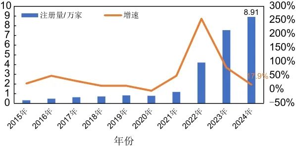 圖4 2015—2024年中國儲能企業(yè)年新增注冊量及增速