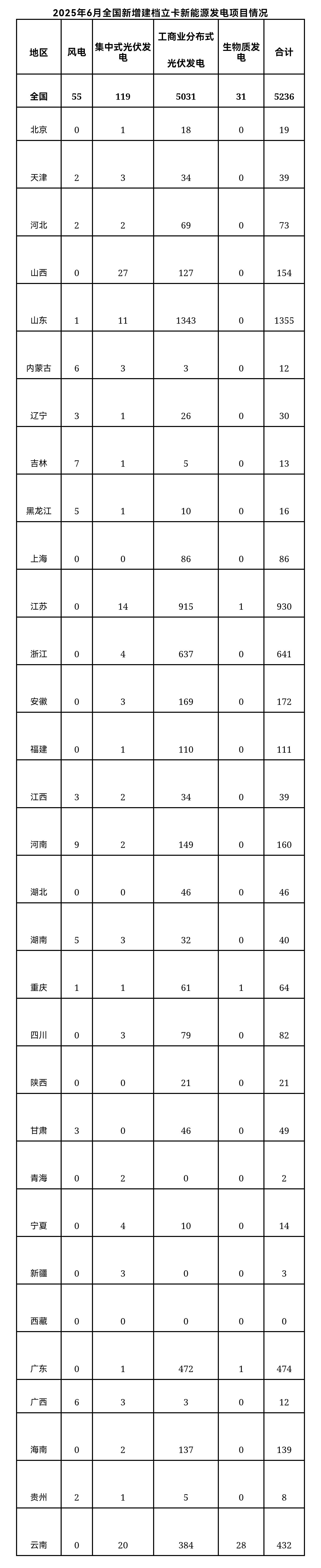 中國儲(chǔ)能網(wǎng)訊:2025年6月,全國新增建檔立卡新能源發(fā)電(不含戶用光伏)項(xiàng)目共5236個(gè),其中風(fēng)電項(xiàng)目55個(gè),光伏發(fā)電項(xiàng)目5150個(gè)(集中式光伏發(fā)電項(xiàng)目119個(gè),工商業(yè)分布式光伏發(fā)電項(xiàng)目5031個(gè)),生物質(zhì)發(fā)電項(xiàng)目31個(gè)。風(fēng)電、集中式光伏發(fā)電、生物質(zhì)發(fā)電項(xiàng)目清單見附件,工商業(yè)分布式光伏發(fā)電項(xiàng)目清單詳見國家可再生能源發(fā)電項(xiàng)目信息管理平臺(tái)網(wǎng)站(網(wǎng)址https://jdlk.renewable.org.cn/card-info-sheet/)。