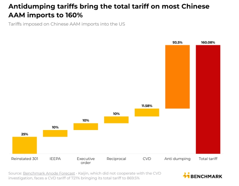 這使得活性陽極材料(AAM)產(chǎn)品的總關稅攀升到160%,包括之前宣布的電池專用和一般關稅,如下圖所示。