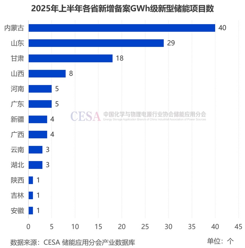 據(jù)CESA儲(chǔ)能應(yīng)用分會(huì)產(chǎn)業(yè)數(shù)據(jù)庫(kù)不完全統(tǒng)計(jì),2025年上半年,全國(guó)共新增備案了122個(gè)GWh級(jí)儲(chǔ)能項(xiàng)目,主要分布在山東、內(nèi)蒙古、甘肅、山西等省份。