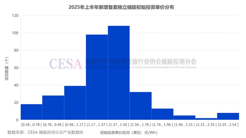 據(jù)CESA儲(chǔ)能應(yīng)用分會(huì)產(chǎn)業(yè)數(shù)據(jù)庫(kù)不完全統(tǒng)計(jì),2025年上半年新增備案的項(xiàng)目中,鋰電獨(dú)立儲(chǔ)能項(xiàng)目初始投資價(jià)格主要分布在0.58-2.54元/Wh區(qū)間內(nèi),平均單價(jià)1.3607元/Wh。超過(guò)一半的獨(dú)立儲(chǔ)能備案項(xiàng)目初始投資單價(jià)在1.17-1.56元/Wh范圍內(nèi)。