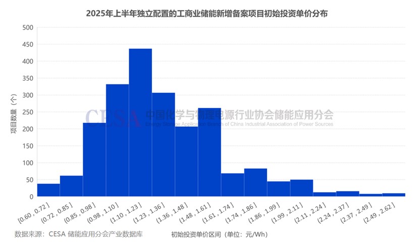 2025年上半年新增備案的項(xiàng)目中,獨(dú)立配置的工商業(yè)鋰電儲(chǔ)能項(xiàng)目初始投資單價(jià)主要集中在0.6-2.62元/Wh區(qū)間內(nèi),平均價(jià)格1.304元/Wh。82.3%的工商儲(chǔ)項(xiàng)目初始備案投資單價(jià)在0.85-1.61元/Wh范圍內(nèi)。