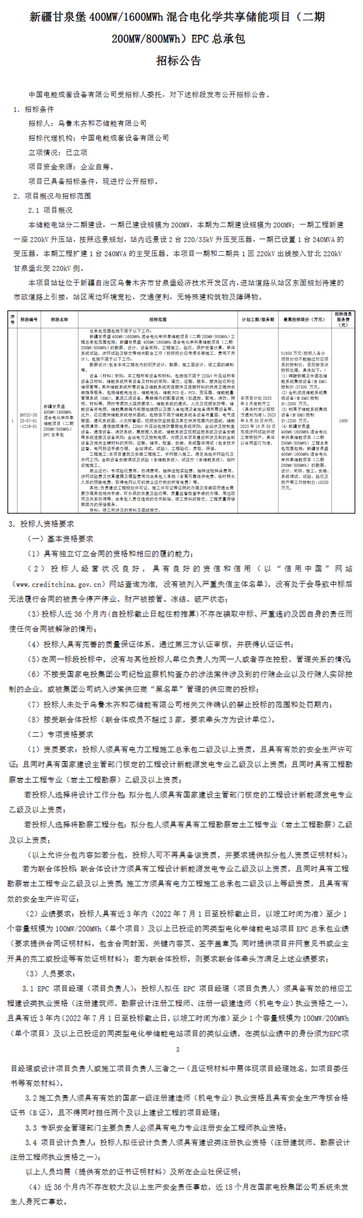中國(guó)儲(chǔ)能網(wǎng)訊:7月31日,新疆甘泉堡400MW/1.6GWh混合電化學(xué)共享儲(chǔ)能項(xiàng)目(二期200MW/800MWh)EPC招標(biāo),項(xiàng)目招標(biāo)人為烏魯木齊和芯儲(chǔ)能有限公司。