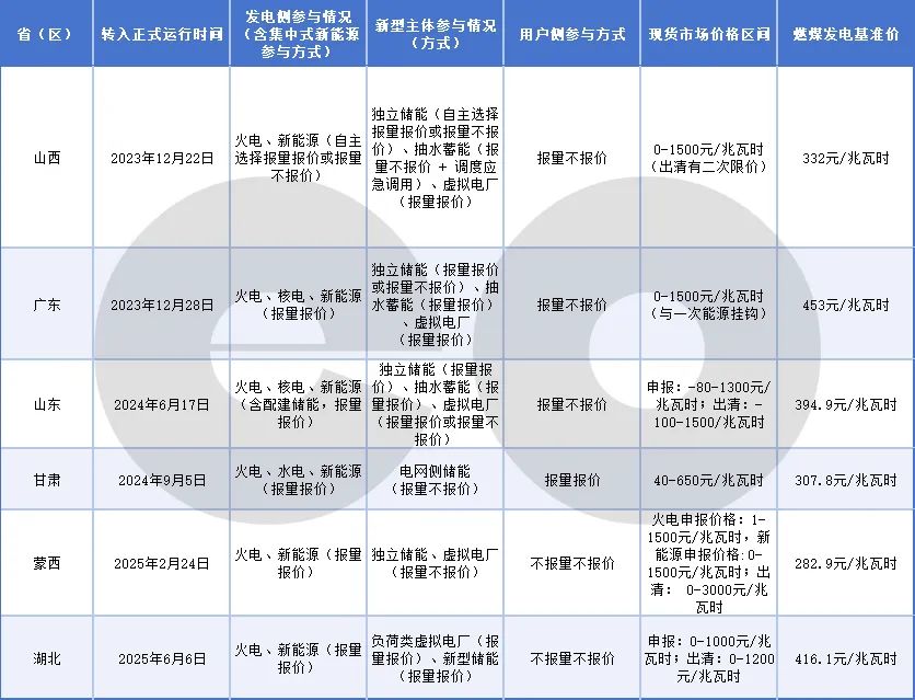 截至發(fā)稿,首批試點(diǎn)地區(qū)中的山西、廣東、山東、甘肅、蒙西和第二批試點(diǎn)地區(qū)中的湖北以及省間電力現(xiàn)貨市場(chǎng)已轉(zhuǎn)入正式運(yùn)行。