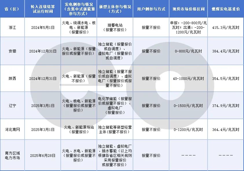 浙江、安徽、陜西、遼寧、河北南網(wǎng)等地和南方區(qū)域電力市場(chǎng)已轉(zhuǎn)入連續(xù)結(jié)算試運(yùn)行。eo據(jù)公開資料梳理上述地區(qū)最新進(jìn)展如下表: