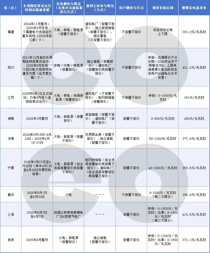 福建、四川、江蘇、湖南、河南、寧夏、重慶、上海、吉林等地已開展過(guò)整月及以上長(zhǎng)周期結(jié)算試運(yùn)行。eo據(jù)公開資料梳理上述地區(qū)最新進(jìn)展如下表: