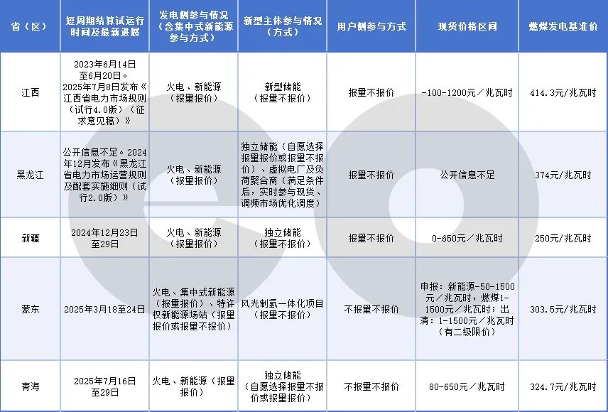 江西、黑龍江、新疆、蒙東、青海等地已開展過(guò)短周期結(jié)算試運(yùn)行。eo據(jù)公開資料梳理上述地區(qū)最新進(jìn)展如下表: