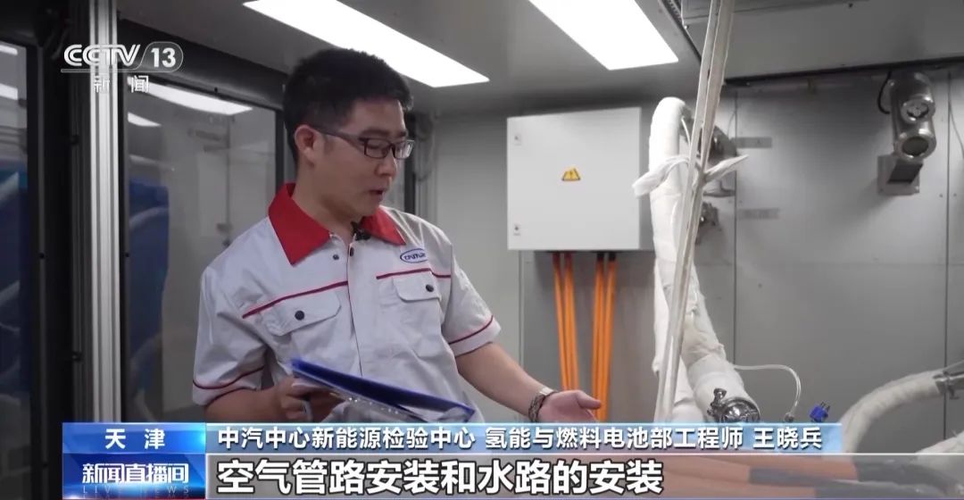 中汽中心新能源檢驗(yàn)中心氫能與燃料電池部工程師 王曉兵:在測(cè)試之前我們基本都會(huì)對(duì)樣品進(jìn)行燃料電池的氣密性的檢測(cè),保證氫氣不會(huì)泄漏,包括整個(gè)氫氣管路的安裝、空氣管路安裝和水路的安裝,以及電子負(fù)載的負(fù)載線安裝,必須確保每一個(gè)連接步驟的安全性。