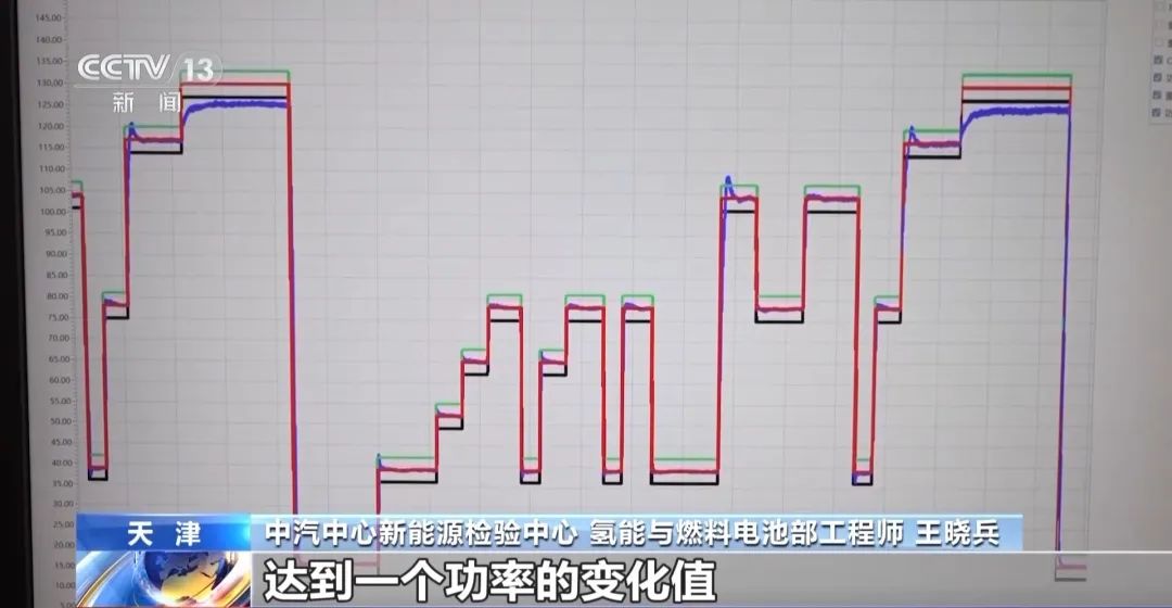 中汽中心新能源檢驗(yàn)中心氫能與燃料電池部工程師 王曉兵:這個(gè)線就是基于我們實(shí)際道路模擬司機(jī)的行為,開始啟停、高速、怠速,然后轉(zhuǎn)化出來的針對(duì)這個(gè)系統(tǒng)的工況。紅色的是實(shí)際要求達(dá)到一個(gè)功率的變化值,藍(lán)色的就是實(shí)際發(fā)出來的自己的表現(xiàn)。