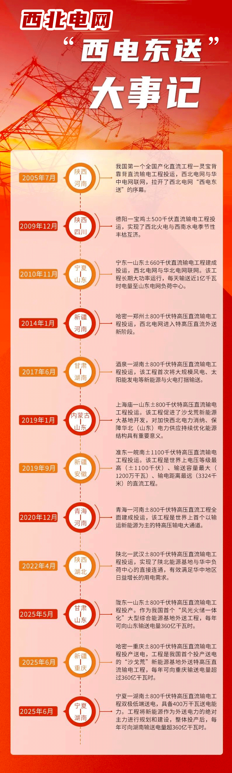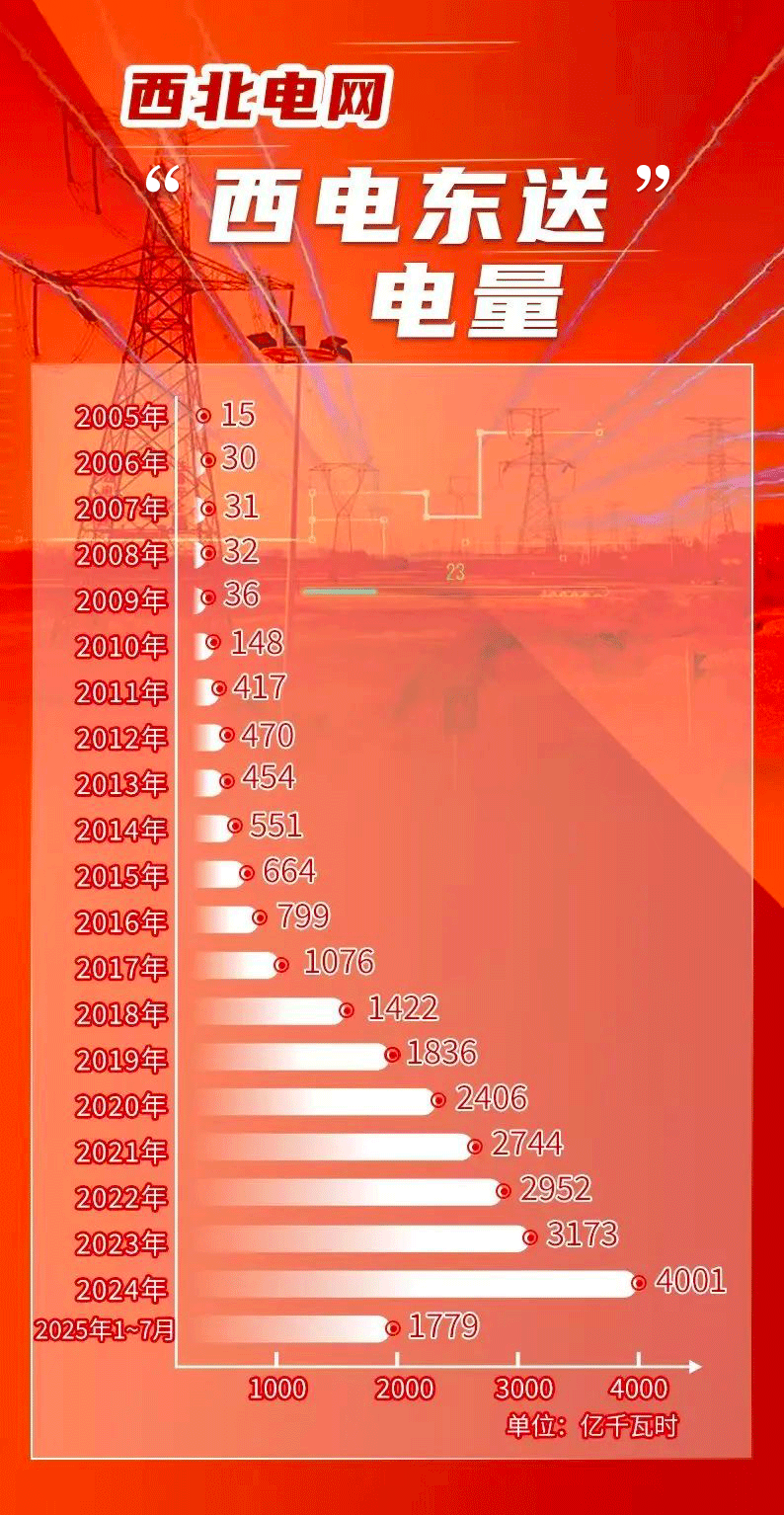 截至2025年7月,西北電網(wǎng)“西電東送”累計(jì)外送電量已突破2.5萬(wàn)億千瓦時(shí)。從2005年7月到2025年7月,西北電網(wǎng)“西電東送”已走過(guò)了整整20年。