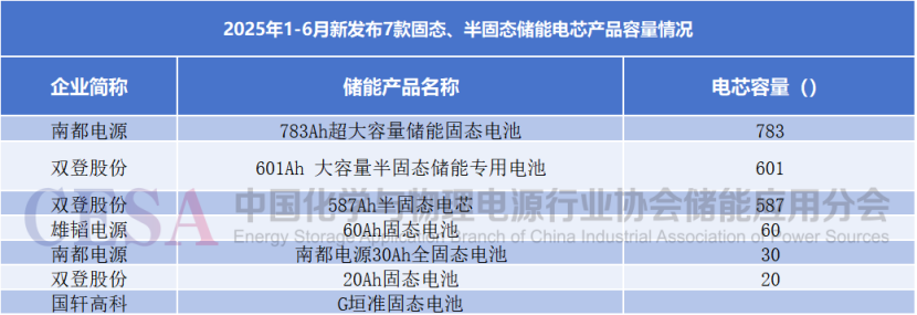 2025年1月至6月期間,儲(chǔ)能行業(yè)共推出七款固態(tài)及半固態(tài)儲(chǔ)能電芯產(chǎn)品,涵蓋多個(gè)技術(shù)路線與應(yīng)用場景,展現(xiàn)出行業(yè)在電芯容量突破與技術(shù)迭代上的顯著進(jìn)展。南都電源率先發(fā)布兩款產(chǎn)品,其中"783Ah固態(tài)電池"以783Ah的容量創(chuàng)下同期最高紀(jì)錄,彰顯其在大型儲(chǔ)能領(lǐng)域的技術(shù)實(shí)力;另一款"30Ah全固態(tài)電池"則聚焦小型化場景,形成高低搭配的產(chǎn)品矩陣。