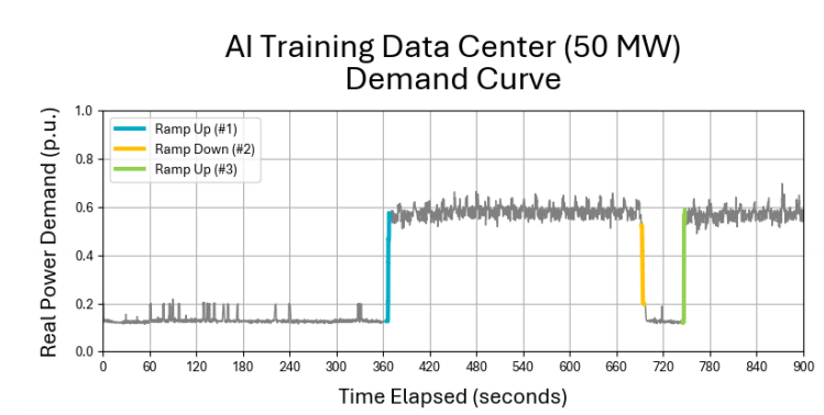 圖1:AI訓(xùn)練時數(shù)據(jù)中心(50兆瓦級)的實時功率曲線