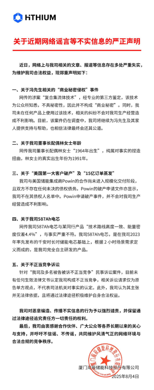 8月4日晚間,海辰儲(chǔ)能通過(guò)官方渠道發(fā)布《關(guān)于近期網(wǎng)絡(luò)謠言等不實(shí)信息的嚴(yán)正聲明》,針對(duì)“商業(yè)秘密侵權(quán)”“美國(guó)第一大客戶破產(chǎn)”“不正當(dāng)競(jìng)爭(zhēng)訴訟”等五大網(wǎng)絡(luò)謠言逐一辟謠,強(qiáng)調(diào)涉案技術(shù)不具秘密性、訂單未受影響,并重申587Ah電芯為自主研發(fā)產(chǎn)品。