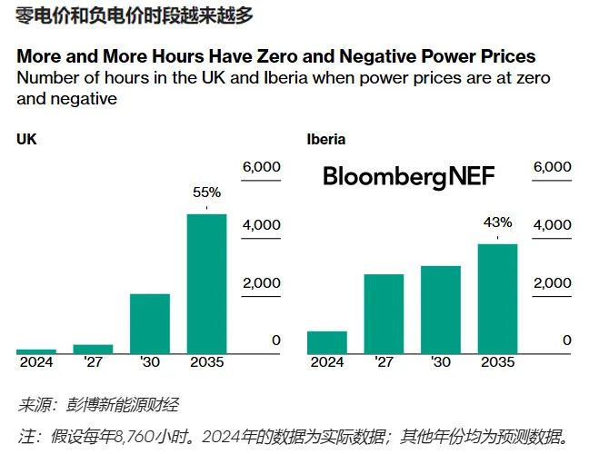 英國和伊比利亞半島是兩個光伏和風電滲透率極高的市場。到2035年,可再生能源將占這些地區(qū)發(fā)電量的80%以上,從而推高棄電率。彭博新能源財經(jīng)估計,英國每年零電價或負電價小時數(shù)將從2024年的157小時增至近4,900小時,占全年8,760小時的55%。在伊比利亞半島,2035年將有3,800小時零電價或負電價,而去年只有800小時。