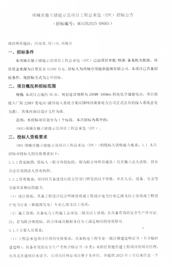 中國(guó)儲(chǔ)能網(wǎng)訊:8月7日,項(xiàng)城市項(xiàng)能新能源有限公司發(fā)布項(xiàng)城市獨(dú)立儲(chǔ)能示范項(xiàng)目工程總承包(EPC)招標(biāo)公告。項(xiàng)目位于河南省周口市項(xiàng)城市,項(xiàng)目資金來(lái)源為自籌資金42400萬(wàn)元,折合單價(jià)1.06元/Wh。