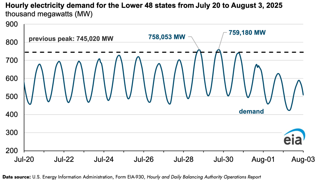 炎熱天氣(推高制冷用電需求)疊加電力需求本身的持續(xù)增長(zhǎng),使得本土48州的“同時(shí)峰值需求”于東部時(shí)間7月28日18:00-19:00達(dá)到758,053兆瓦(MW),創(chuàng)下新高。次日(7月29日),峰值需求再次刷新紀(jì)錄,達(dá)到759,180 MW,比2024年7月15日創(chuàng)下的745,020 MW原紀(jì)錄還高1.9%。
