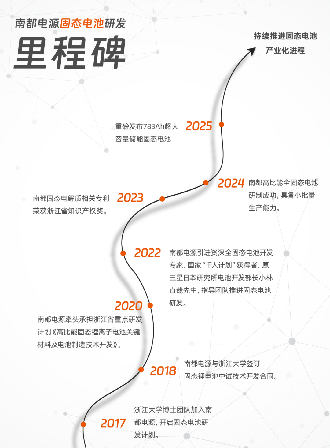一直以來,南都電源以“研發(fā)一代、儲備一代”作為技術(shù)發(fā)展戰(zhàn)略,持續(xù)開展前瞻性研究。公司自2017年展開固態(tài)電池研制工作,是國內(nèi)最早布局固態(tài)電池的企業(yè)之一。