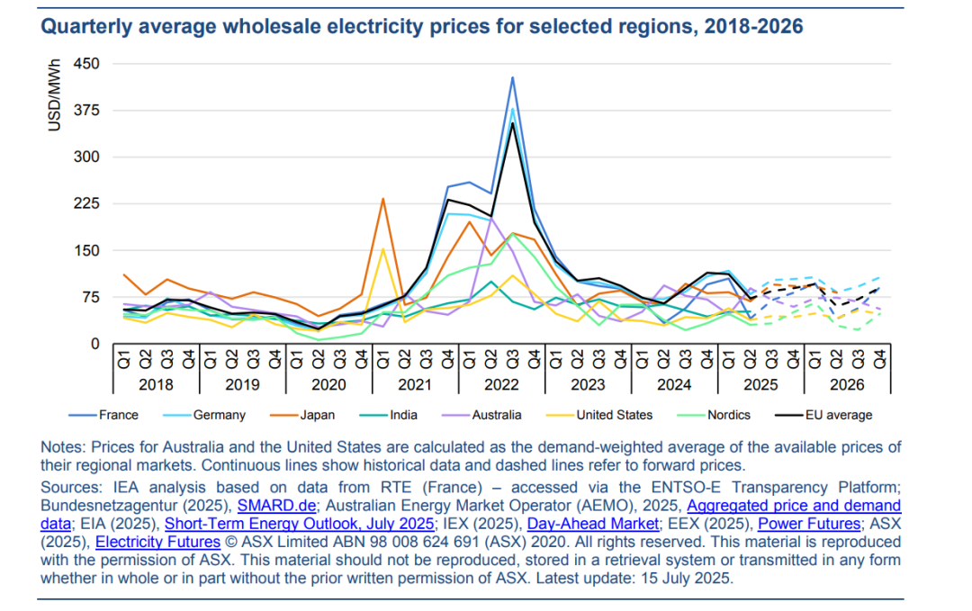 歐盟2025年上半年批發(fā)電價(jià)同比漲30%至90美元/兆瓦時(shí),天然氣價(jià)格則同比高出約20%。在歐盟碳排放交易體系(EU-ETS)下,二氧化碳排放配額成本上升至約70歐元/噸。與此同時(shí),風(fēng)能和水能發(fā)電同比降幅度較大,推動(dòng)了化石燃料發(fā)電量的增加,進(jìn)一步推高了電力價(jià)格。歐盟最新的2026年電力期貨平均價(jià)格為80美元/兆瓦時(shí),預(yù)示電價(jià)有望下降。