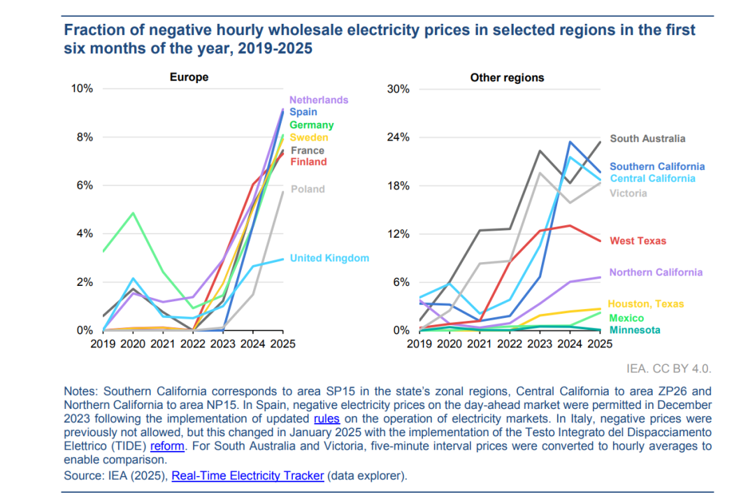 在歐洲,負(fù)電價(jià)的情況正變得越來越普遍。上半年,在德國、荷蘭和西班牙等國,批發(fā)市場(chǎng)上的負(fù)電價(jià)時(shí)段占比達(dá)到了8%-9%,高于2024年的4% -5%。